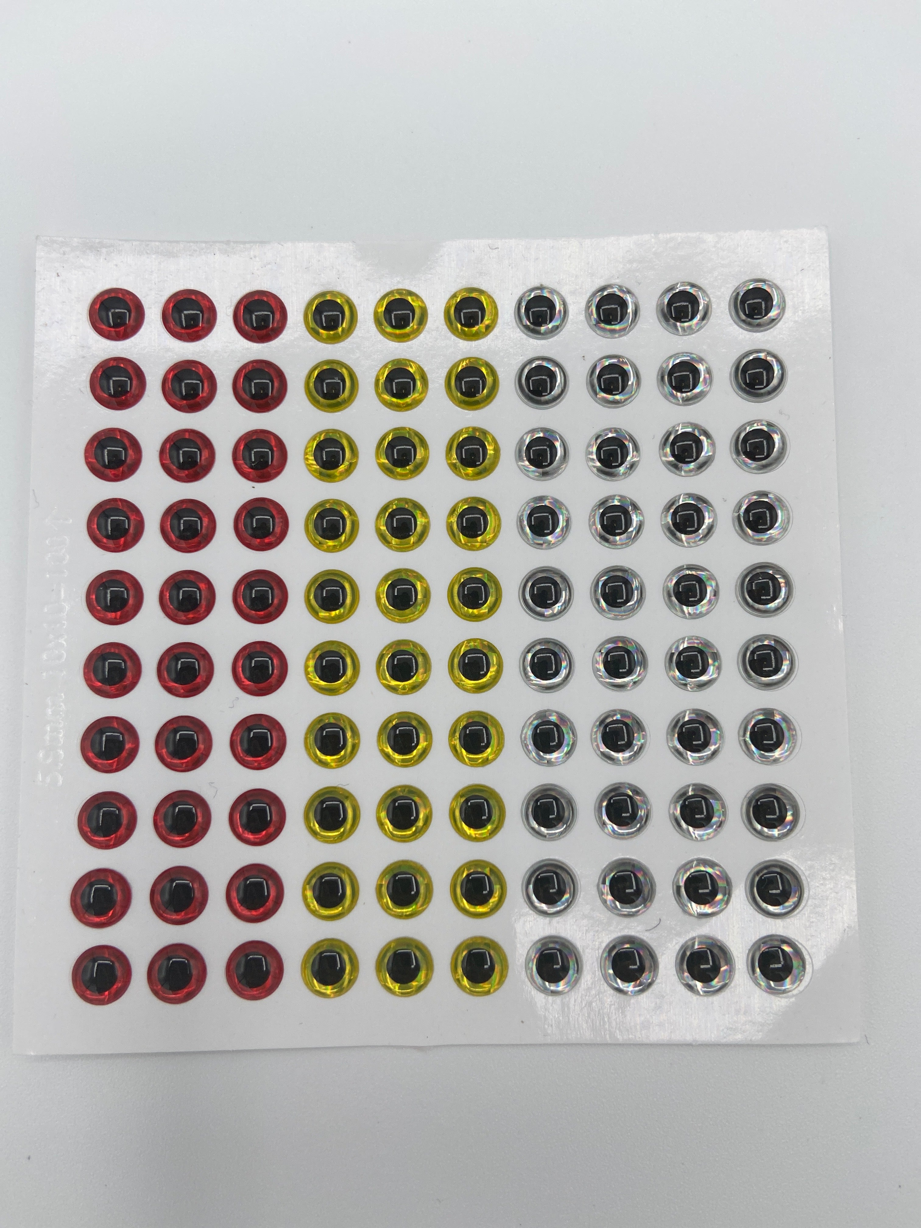 These self-adhesive fisheyes are available in 6mm or 8mm sizes and are totally compatible with our Transparent fish skull. They are sold in packs of 100 and have three colors on one card, red, pearl, and yellow.